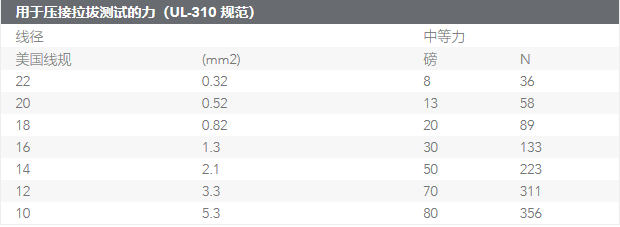 向壓接拉拔測試顯示的力表示將導(dǎo)線從軸中的壓接端子分離(沿著與從接觸件到導(dǎo)線出口方向平行的方向)所需的最小力。該力不包括絕緣壓接(如果適用)的固定力。